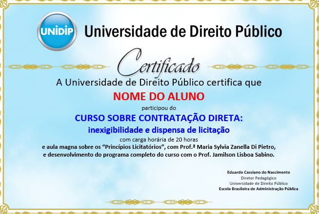 Após a realização da prova, com a confirmação da aprovação, será emitido em PDF e enviado por e-mail o certificado de conclusão do curso, constituindo título curricular relevante, registro acadêmico permanente e documento de valor histórico. Destaca-se que: a) o certificado confirma a participação em uma formação inaugurada por aula magna com a maior autora da história do Direito Administrativo brasileiro; b) o vínculo acadêmico com um curso desenvolvido e coordenado pelo Professor Doutor Jamilson Lisboa Sabino, jurista, professor e autor; c) a chancela institucional da UNIDIP – Universidade de Direito Público, com assinatura de seu Diretor Pedagógico.